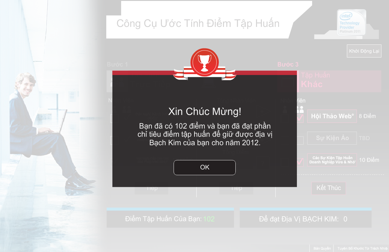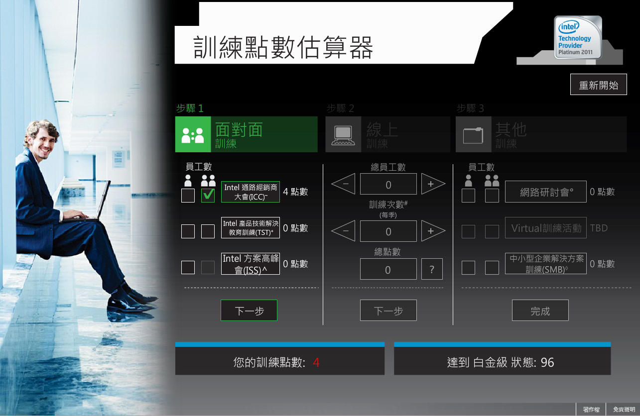 The aim of this site is to support Intel's partners and distributors in estimating their attendance in training courses offered by the company in order to maintain their privileged membership. For each type of membership, users have to select the courses with number of attendees, various training types and courses. The system will automatically calculate the credits members would be able to gain from said inputs. Disclaimer and a notice box will appear at the beginning and at the end respectively congratulating users having fulfilled the required credits. The most tricky part making text components flexible so that the site is interchangeable within 6 different languages.